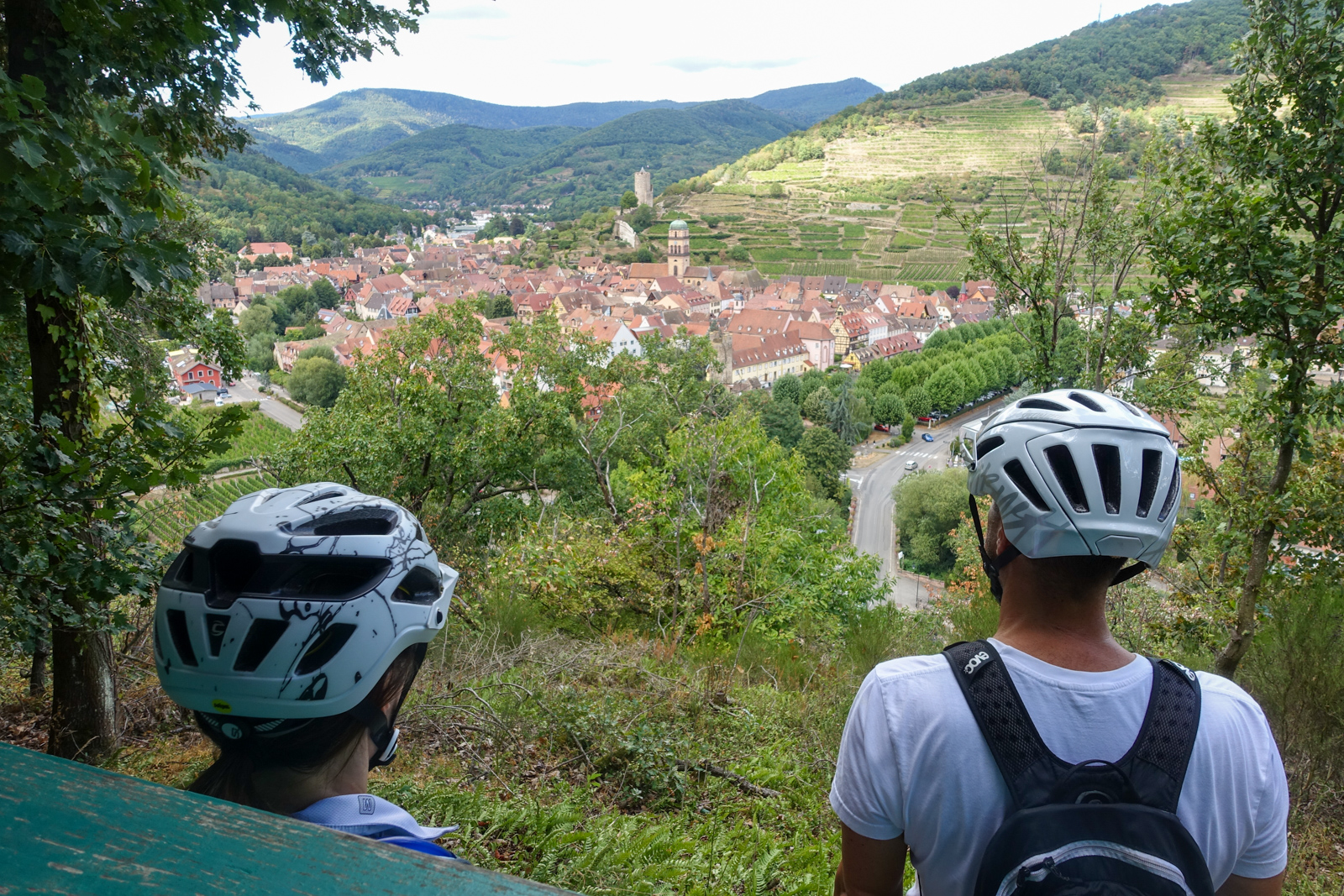 Auf Forstwegen mit angenehmer Steigung geht es direkt hoch zum ehemaligen Kurort Trois Epis – sogar für ein erstes kleines Singletrail-«Amuse bouche» wird es bereits reichen. Bis ganz nach oben zum Monument du Galtz fehlt ein letztes steiles Stück, bevor zuerst die grandiose Aussicht und anschliessend die lange Flow-Abfahrt nach Ammerschwihr mehr als eine würdige Belohnung sind. Nach einem kurzen Abschnitt auf der Strasse erreichen wir den zweiten Aufstieg des Tages, ebenfalls auf schattigen Forstwegen. Oben angekommen stehen wir erneut am Start eines langen Flow-Trails, der nun auch mit der einen oder anderen Spitzkehre aufwartet. Über einen kurzen Gegenanstieg gelangen wir zum grandiosen Schlusstrail bis direkt an die Stadtmauern vom schmucken Kaysersberg. Eine Besichtigung lohnt sich wegen des hübschen Städtchens und für den Besuch einer der himmlischen Boulangeries. Die Rückfahrt führt auf Veloweg mitten durch ein Meer aus Reben nach zurück nach Turckheim.