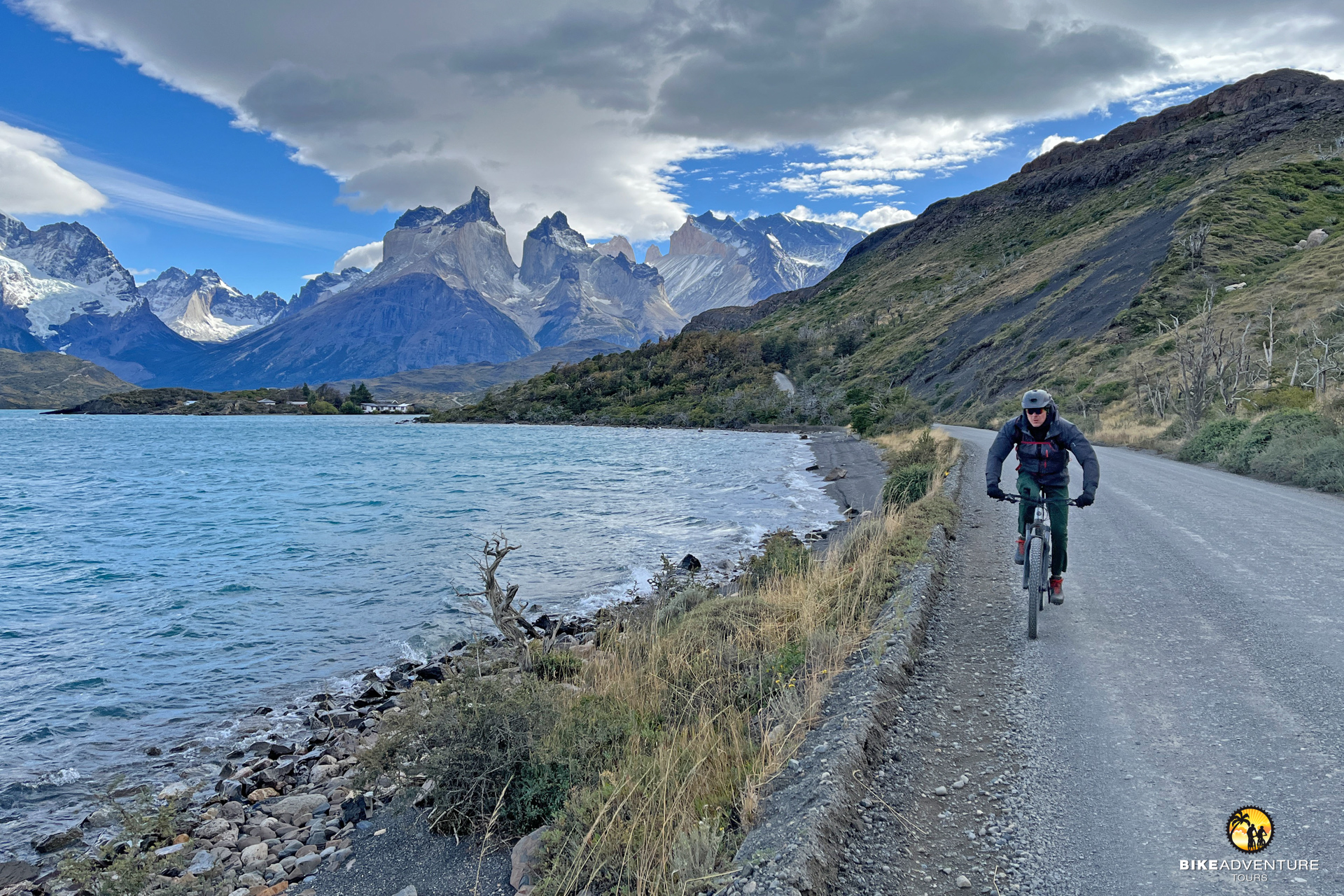 Nach einem kurzen Transfer werden wir die Fahrt durch den Nationalpark mit dem Bike fortsetzen. Zahlreichen Fotostopps unterbrechen den Rhythmus, aber diese sind der spektakulären Landschaft geschuldet. Die Schotterstrassen (Ripio-Pisten) sind rau, aber gut fahrbar. Bald tauchen auf der linken Seite die drei Granittürme – die legendären Torres del Paine – in voller Wucht auf. Je nach Licht- und Wetterstimmung wirken sie golden, grau oder fast schwarz. Weiter führt der Weg vorbei an smaragdgrünen Seen wie dem Lago Nordenskjöld, wo türkisfarbenes Wasser mit schneebedeckten Gipfeln konkurriert. Die Straße schlängelt sich durch dramatische Landschaften. Ein Höhepunkt ist der Blick auf die Cuernos del Paine – zackenartige Fels-formationen mit dunklem Gestein an der Spitze und hellem Granit darunter, als hätte die Natur selbst einen Pinsel geschwungen.