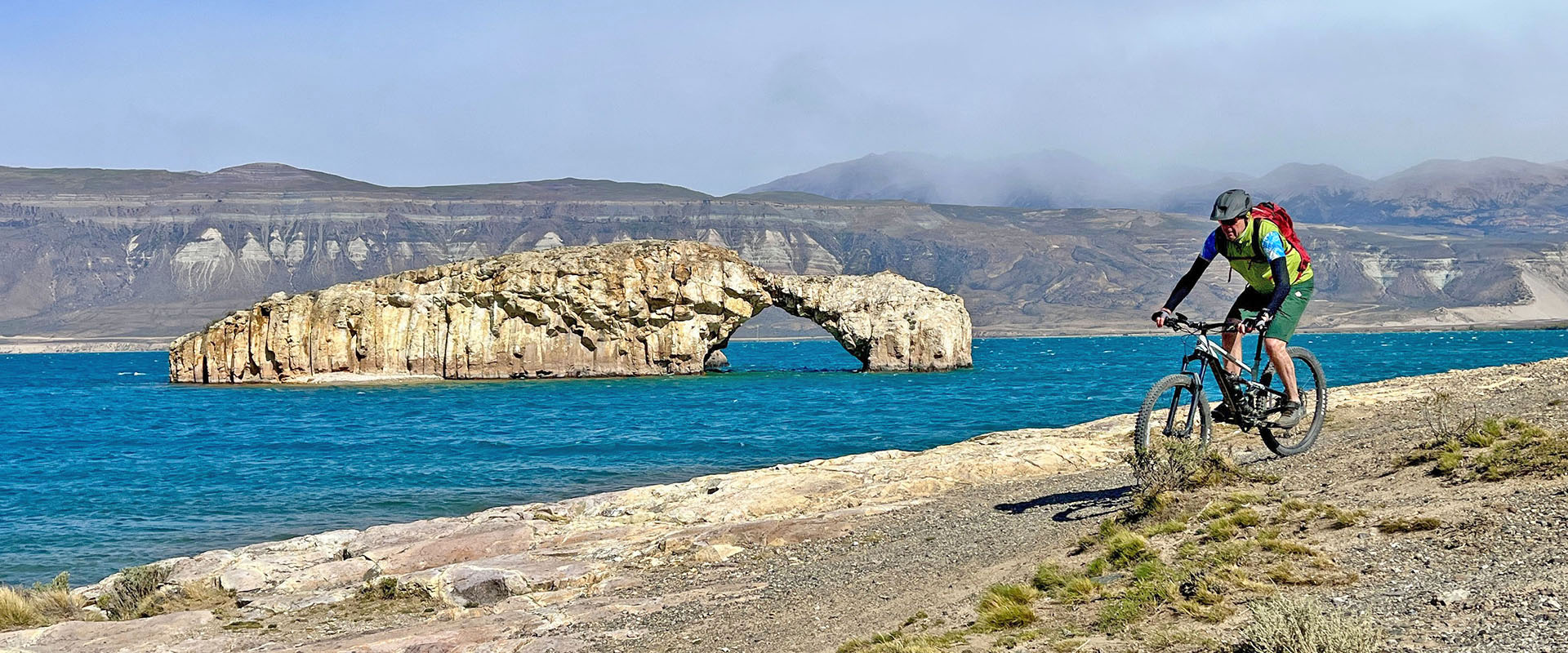 Für den heutigen Tag gibt es verschiedene Optionen – allesamt in einmaliger und einsamer patagonischer Landschaft. Der Lago Posadas hat eine intensive türkis-grünliche Färbung, die durch die Mineralien des Gletscherwassers entsteht. Nicht weit entfernt liegt der Lago Pueyrredón, die unterschiedlichen Farben nebeneinander sind ein faszinierendes Naturphänomen. Eine natürliche Felsbrücke am Ufer des Sees – Arco de Piedra – dient uns als willkommener Rastplatz. Dieses einzigartige Naturdenkmal ist ein beliebtes Fotomotiv. Fasziniert von der rauen und archaischen Szenerie, die durch Jahrmillionen geologischer Aktivität und ständiger Winderosion geformt wurde, radeln wir zurück zu unserem schmucken Hotel.
