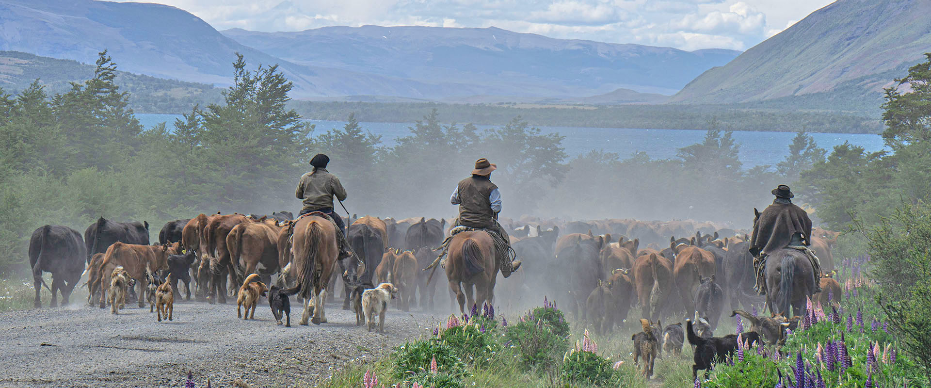 Nach diesem Eintauchen in die Welt der Gauchos mit bombachas (weiten Hosen), ponchos, caronas (breiten Gürteln), und boinas (Berets), satteln wir wieder unsere Drahtesel. Auf einer coupierten Naturstrasse biken wir zurück in Richtung El Calafa-te. Dort verladen wir und unser Begleitbus bringt uns in einem längeren Transfer nach Süden an den einsamen chilenischen Grenzposten. Wir verlassen Argentinien und bleiben für zwei Nächte im grenznahen Dorf Cerro Castillo.