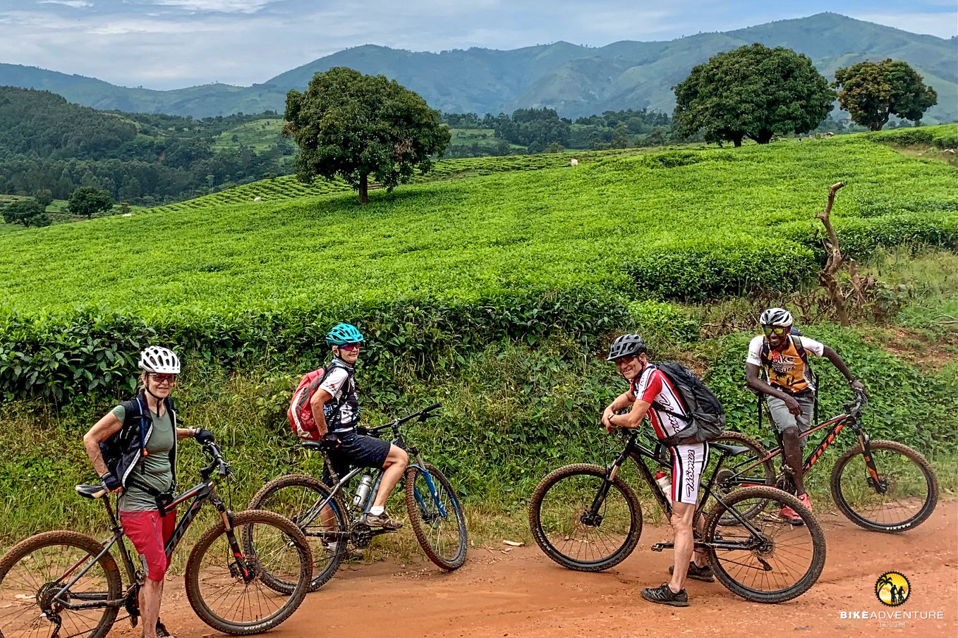 Direkt vom Hotel aus starten wir in einen langen, genussvollen Downhill auf einer breiten Naturpiste durch den Wald, unterbrochen von wenigen kurzen Anstiegen. Immer wieder tauchen leuchtend grüne Teefelder entlang der Strecke auf und bilden einen wunderschönen Kontrast zur dichten Vegetation. Uganda ist ein bedeutendes Teeexportland. Neben Kaffee zählt auch Tee zu den wichtigsten Exportgütern des Landes. Die fruchtbaren Böden und das günstige Klima dieser Regionen fördern den Anbau von hochwertigem Tee, der auf internationalen Märkten geschätzt wird.